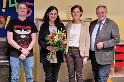 Daher gratulierten in einer Feierstunde am Freitag, den 26. September 2025 die Schülerinnen und Schüler, sowie auch der Lehrkörper beider Schulen, vertreten durch David SCHNEIDER (NMS) und Marianne ROHRER (VS) der neuen Schulrätin herzlich und dankten für ihren umsichtigen Einsatz für die Institute. Auch der Volksschulchor sang der neuen Oberschulrätin ein Ständchen. | ![]() |