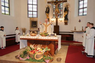 Auf dem herbstlich geschmückten Altar mit den Körben Brot und Wein, sowie einem mit verschiedenen Früchten verzierten „Erntekorb“ vor dem Altar zelebrierte Pfarrer P. Mag. Michael FRITZ OSB. die Hl. Messe und segnete die Erntegaben. Musikalisch umrahmt wurde die Festmesse vom Jugendmesschor Immendorf unter der Leitung von Tanja TRAPPL. Pfarrer P. Michael segnete nach der Messe auch die Erntegaben der Kinder. | ![]() |