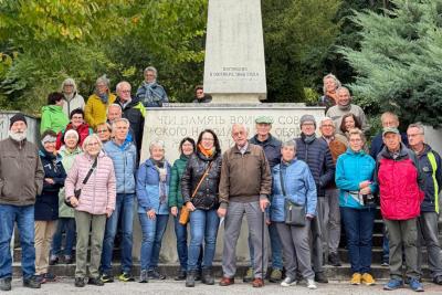Man besichtigte Hubertusdenkmal und Generationenspielplatz, Jahntempel und Russenfriedhof, Rosenkreuz und Bildereiche. Die Standorte der insgesamt drei ehemaligen Waldschenken wurden erkundet und Reste von Schützengräben aus dem Kriegsjahr 1945 entdeckt. Im Waldtal „Walhalla“ gab es eine Erläuterung der Bedeutung dieses Namens, bevor der restliche Weg durch die Sparkassasiedlung vorbei am Neubaugebiet hinter dem Friedhof und einem Blick auf Hollabrunns private Sternwarte zurück an den Ausgangspunkt beim „Siedlungsbankerl“ führte. Es waren zwei eindrucksvolle Stunden, um ein Stück Hollabrunn besser kennen zu lernen. | ![]() |