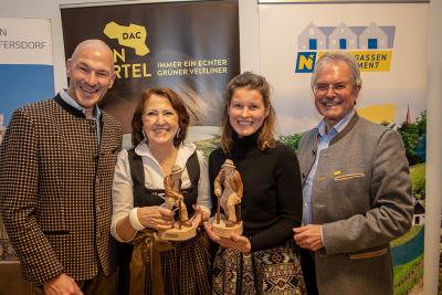Landtagspräsident Karl Wilfing überreichte an Ilse Gritsch aus Dürnleis und DI Doris Knoll von der Baudirektion des Landes NÖ die Holzskulptur für den „Köllamaunn 2025“. Zwei Preisträgerinnen sind eine Premiere, denn bisher gab es immer nur einen Preisträger. Beide Damen wurden für ihre in diesem Jahr 2025 erworbenen Verdienste rund um die Kellergassen ausgezeichnet. Die Skulpturen zum Köllamaunn wurde mit freundlicher Unterstützung seitens der Niederösterreichischen Versicherung und des Kulturvereins Schloss Liechtenstein finanziert. Geschnitzt hat den Köllamaunn der Holzkünstler Leopold Schießer aus Röhrabrunn.
