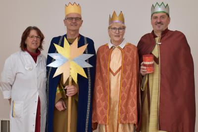 Im Bild v.l.n.r.: Klinikums-Seelsorgerin Gabriele Granser, BA, die Hl. Drei Könige (Robert Krehan, Maria Schneider und Franz Schneider) | |