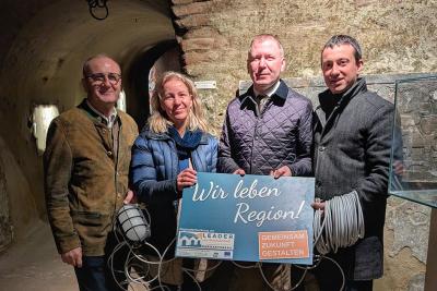 Vertreter der LEADER-Region Weinviertel–Manhartsberg machten sich nun gemeinsam mit der Stadtgemeinde Retz ein Bild vom Projektfortschritt. Obmann Peter Steinbach sowie Geschäftsführerin Renate Mihle besuchten gemeinsam mit Bürgermeister Stefan Lang und dem Geschäftsführer des Retzer Erlebniskellers, Stadtrat Daniel Wöhrer, die Baustelle im historischen Kellerlabyrinth unter der Stadt Retz.