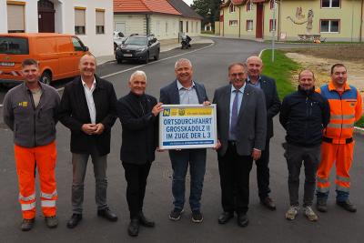 Ortsdurchfahrt von Großkadolz abgeschlossen! Arbeiten für den 2. Abschnitt im Zuge der L 3 Nach der Fertigstellung des rund 180 m langen ersten Abschnittes von der Volksschule bis zum Kindergarten im Vorjahr, sind die Bauarbeiten für den zweiten Bereich bis zum Glockenturm abgeschlossen. | |