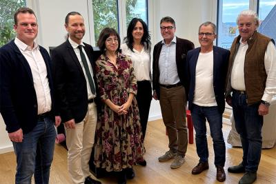 Im Bild: VzBGM Alexander Eckhardt, Thomas Zornig, Susanne Seisenbacher, Edith Beer, STR Kornelius Schneider, Wolfgang Bauda, BGM Alfred Babinsky bei der Praxiseröffnung.