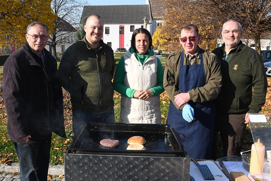 Im Bild – Wullersdorfer Jäger mit Obfrau Kraus und Bgm. Hogl beim Grillen der Wildburger - v.l.n.r.: Richard Hogl, Björn Thämlitz, Ingrid Kraus, Hermann Raab, Alfred Pawle | |