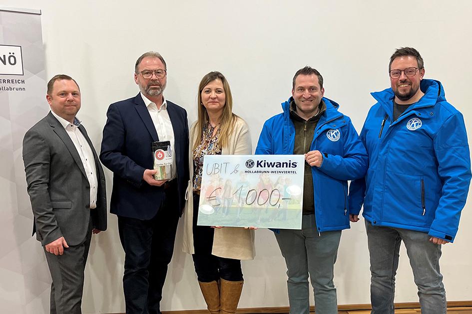 Im Bild v.l.: Patrick Heidrich (UBIT NÖ Bezirkssprecher Korneuburg), Reinhard Indraczek (UBIT NÖ Bezirkssprecher Hollabrunn), Maria Glocker (Mama von Lukas), Peter Kamptner (Spendenbeauftragter der KIWANIS Hollabrunn-Weinviertel) und Bernhard Haunold (Präsident KIWANIS Hollabrunn-Weinviertel)