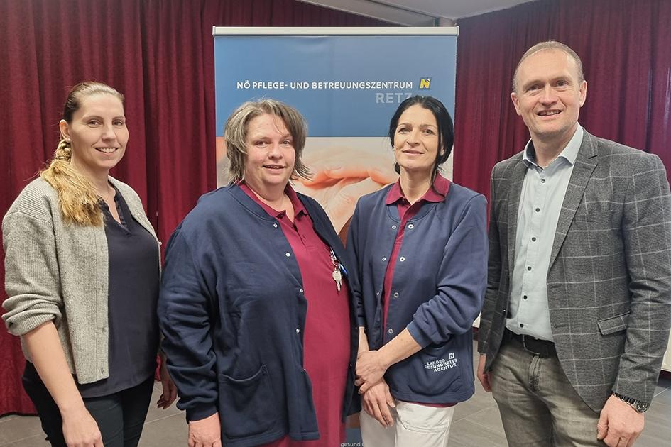 Im Bild: Die neuen Wohnbereichsleiterinnen wurden von der Dualen Führung des PBZ Retz herzlich willkommen geheißen – vlnr.: interimistische Pflegedirektorin Astrid Günes, Pflege- und Betreuungsmanagerin (PBM) Wohnbereich 3 DGKP Astrid Blanka; PBM Wohnbereich 1 DGKP Barbara Thürmer; Kaufmännischer Direktor Horst Winkler, MBA