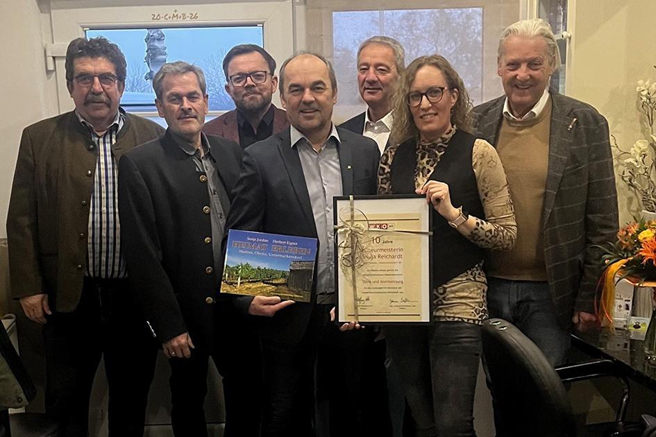 Im Bild: Bürgermeister Manfred Baumgartner, Landesinnungsausschussmitglied der Friseure Peter Studeny, Bezirksstellenleiter Julius Gelles, Bürgermeister Josef Fürnkranz, Gemeinderat (Ortsvorsteher) Andreas Kornherr, Silvia Reichardt, Bezirksstellenobmann Alfred Babinsky