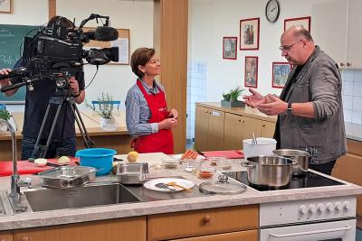 Für den Beitrag zur Serie „Köstlich Kulinarisch“ wurde zuerst beim Hofladen „Bernie’s“ der Familie Bernreiter und danach in der Schulküche der Mittelschule gedreht. „Regionales frisch einkaufen und beim Kochen gleich verwerten“, heißt es immer bei Kochlehrer Karl Riepl. Für die Sendung wurde mit den Kindern und Moderatorin Birgit Brunner ein leckeres Erdäpfelgulasch gekocht. Der Dreh dauerte über vier Stunden und war ziemlich anstrengend, trotzdem war es für alle ein tolles Erlebnis, einmal vor einer Fernsehkamera zu stehen und auch hinter die Kulissen einer Fernsehsendung zu blicken. Zu sehen ist der Beitrag am 14.4. in „Guten Morgen Österreich“ und am Abend dann in NÖ HEUTE. | ![]() |