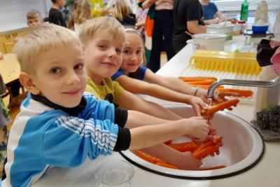 Nach der Wissensvermittlung konnten die Kinder selbst aktiv werden: Sie bereiteten aus frisch geernteten Karotten eine leckere Gemüsesuppe zu und genossen diese als Belohnung für ihre Arbeit. Den Abschluss bildete ein spannendes Spiel im Freien „Der hungrige Maulwurf“, bei dem Teamgeist und spielerisches Lernen erneut im Vordergrund standen.